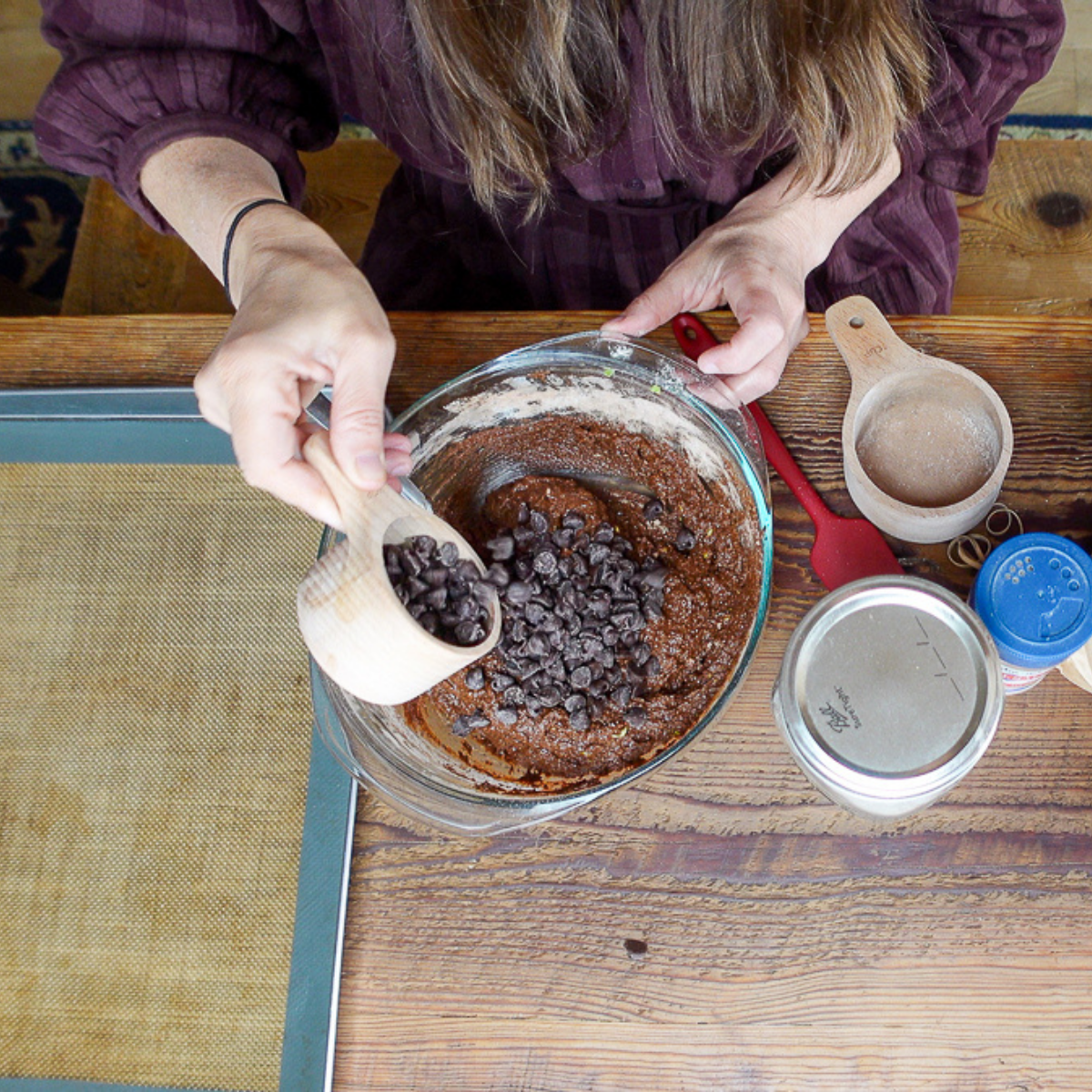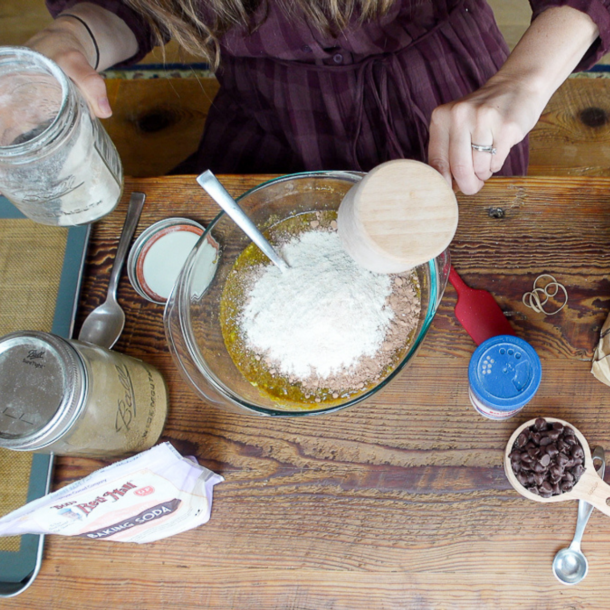 Once combined, add your dry ingredients (cocoa powder, flour, baking soda, and sea salt).